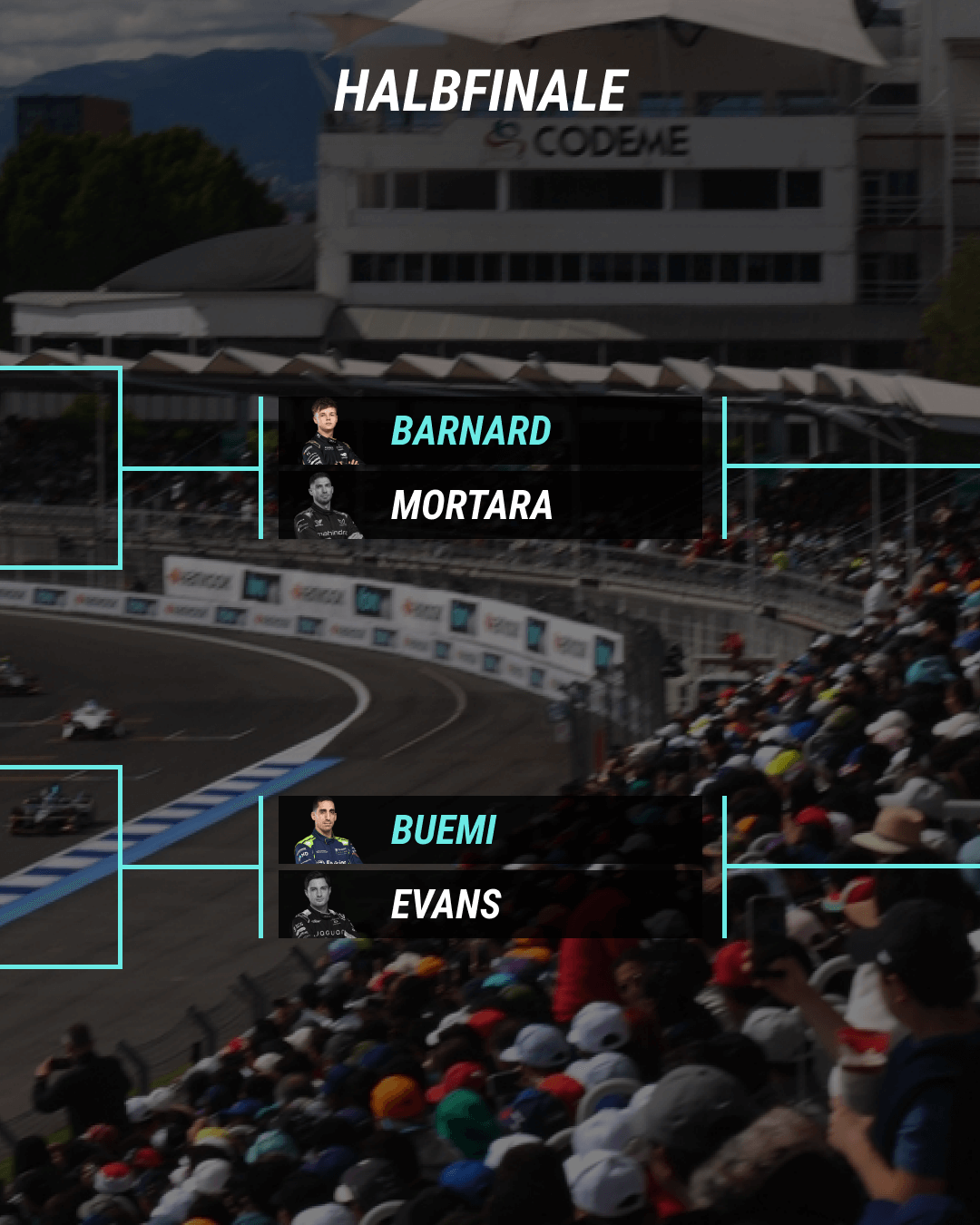 At the Mexico City E-Prix, Briton Taylor Barnard in the DS Penske sets the fastest lap in the final, but loses the pole position after coming off the track with all four tyres in the last corner. Sebastien Buemi therefore starts the race from pole position. While Edoardo Mortara and Mitch Evans start the race from grid row 2, Pascal Wehrlein did not make it into the duels.