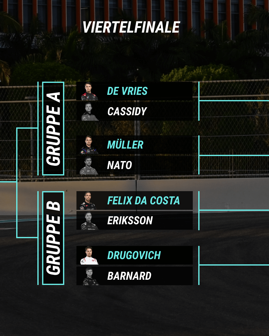 Nato was able to secure his place in the duels, who made himself known at the end when he set the fastest lap time of 0:56.765 minutes. Cassidy, de Vries and Müller also progressed to the duels. For Evans, Rowland, Marti, Buemi, Mortara and di Grassi, qualifying ended at this point.