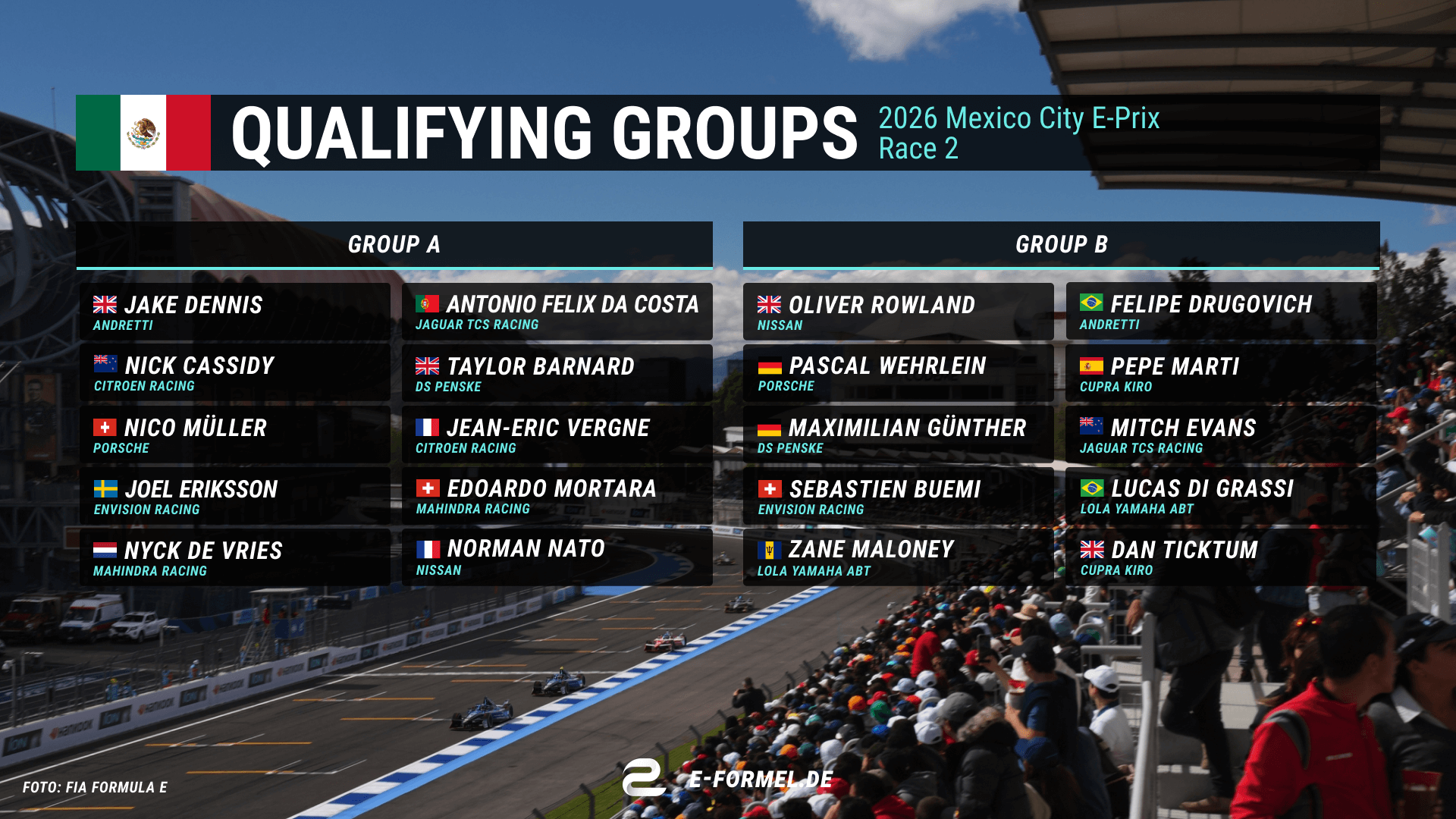 The four drivers with the fastest lap times in their group after ten minutes will then progress to the quarter-finals, where they will duel for the best grid positions. The qualifying groups for the race in Mexico are as follows.