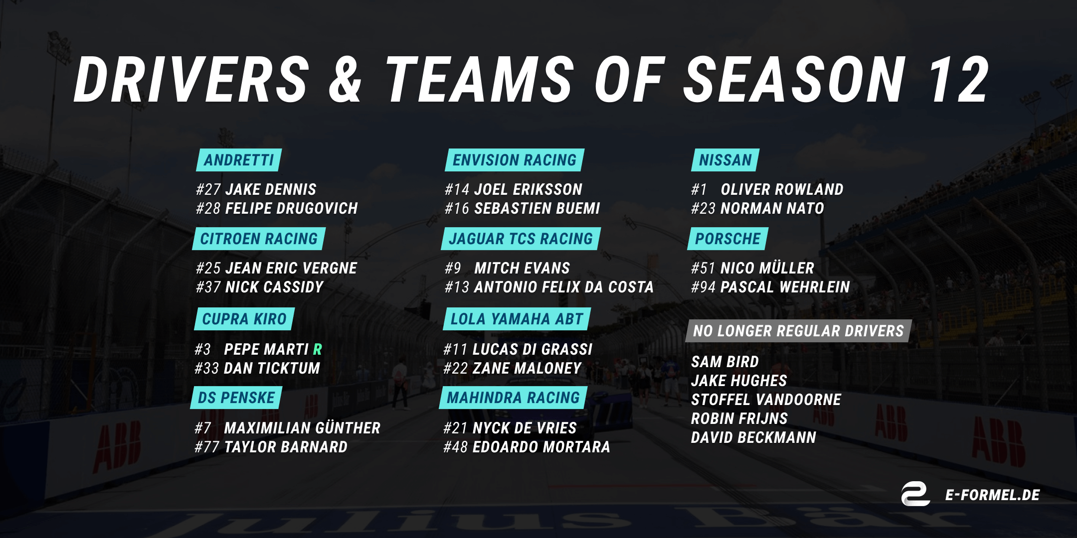 Felipe Drugovich, Joel Eriksson and Pepe Marti will line up as regular drivers for the first time in season 12. Nico Müller makes way for Drugovich at Andretti with his switch to Porsche. Robin Frijns and David Beckmann have to make way for Eriksson and Marti, who do not have a regular seat this season. Antonio Felix da Costa has also left Porsche and will drive alongside Mitch Evans at Jaguar TCS Racing in future.
